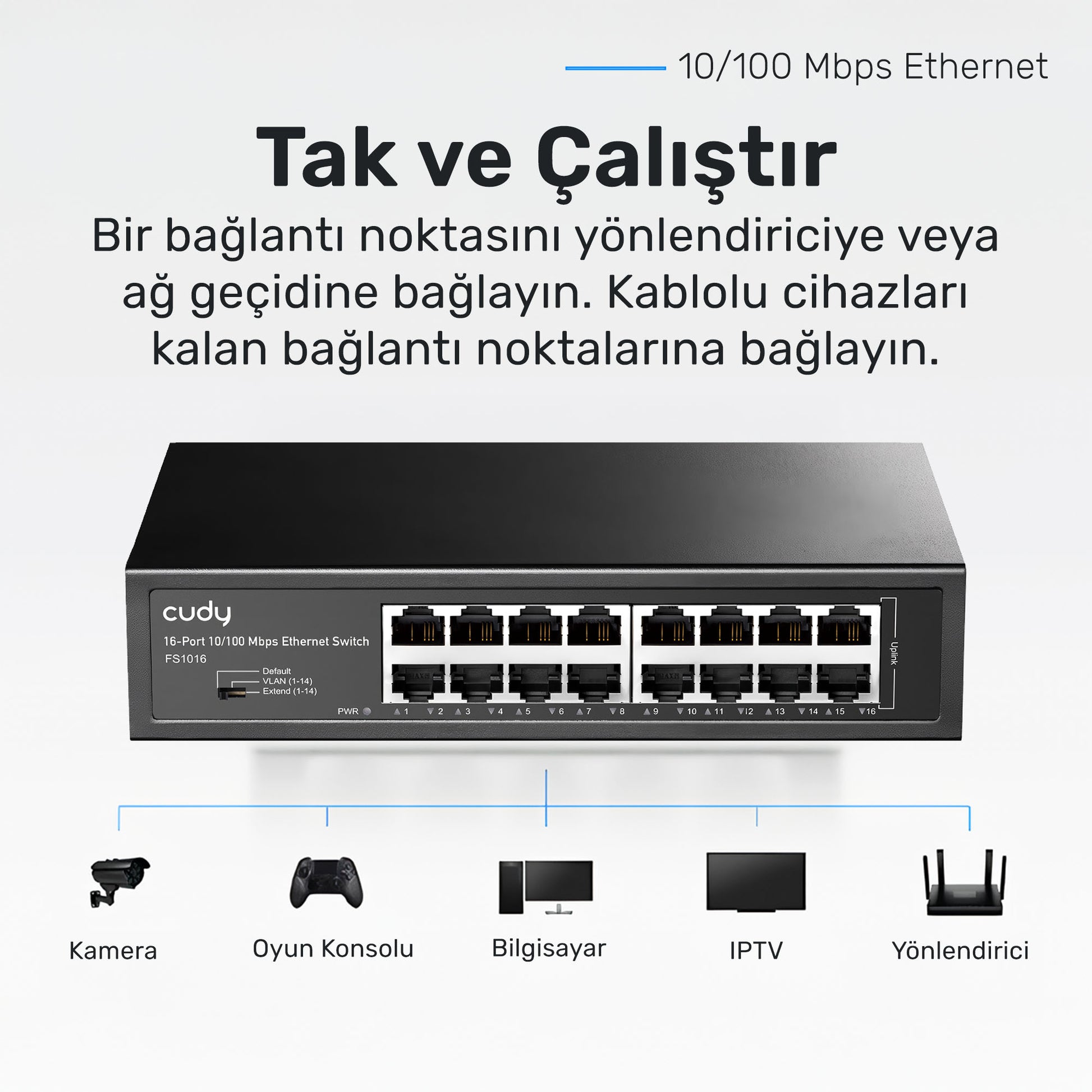 16 adet 10/100 Mbps portuyla aynı anda birden fazla cihazın bağlanmasını sağlar. Küçük ve orta ölçekli ağlar için ideal bir çözüm sunar.