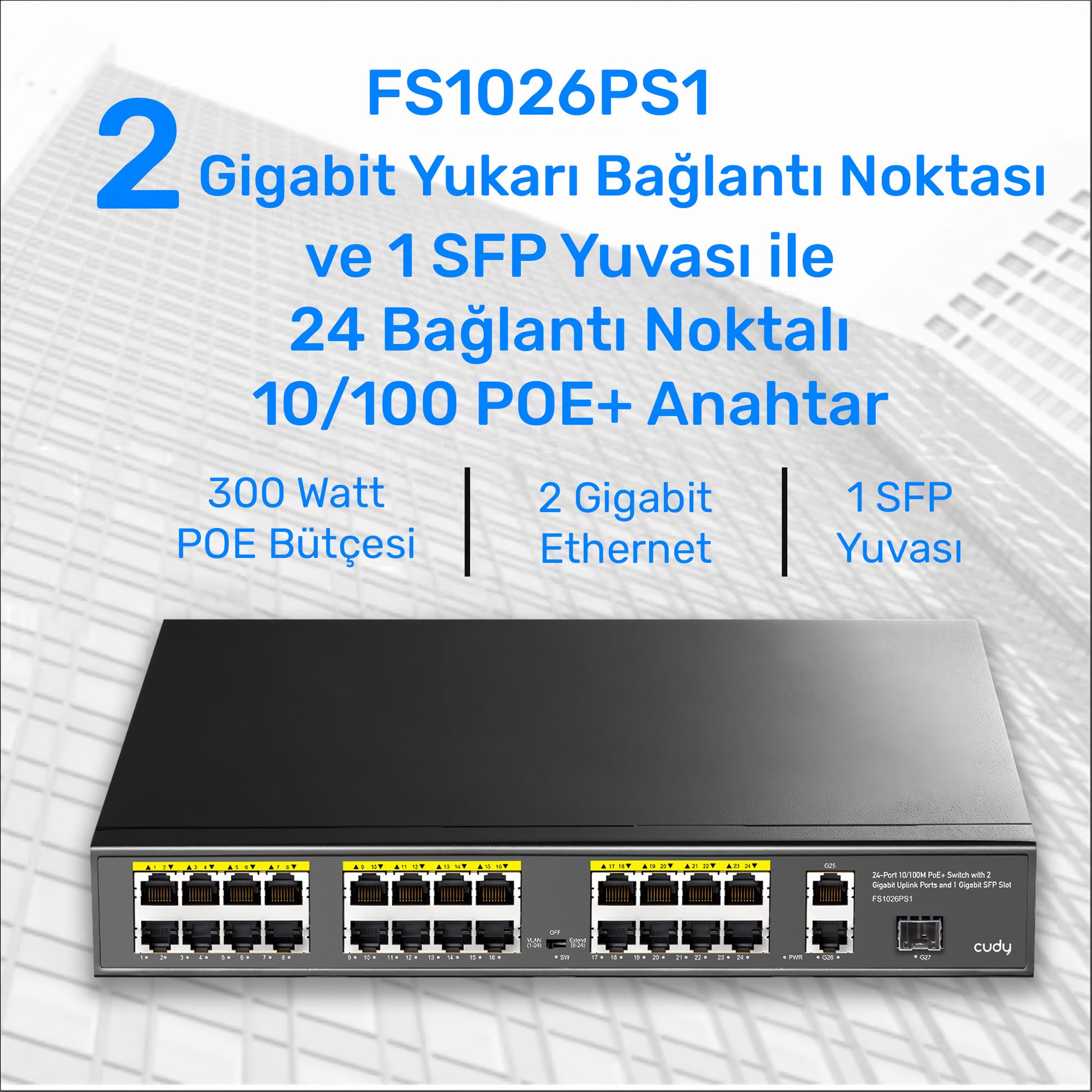 Cudy FS1026PS1 300W PoE+ 24 Port 10/100Mbps+ 2 Port 10/100/1000Mbps Gigabit+1 Port SFP Switch