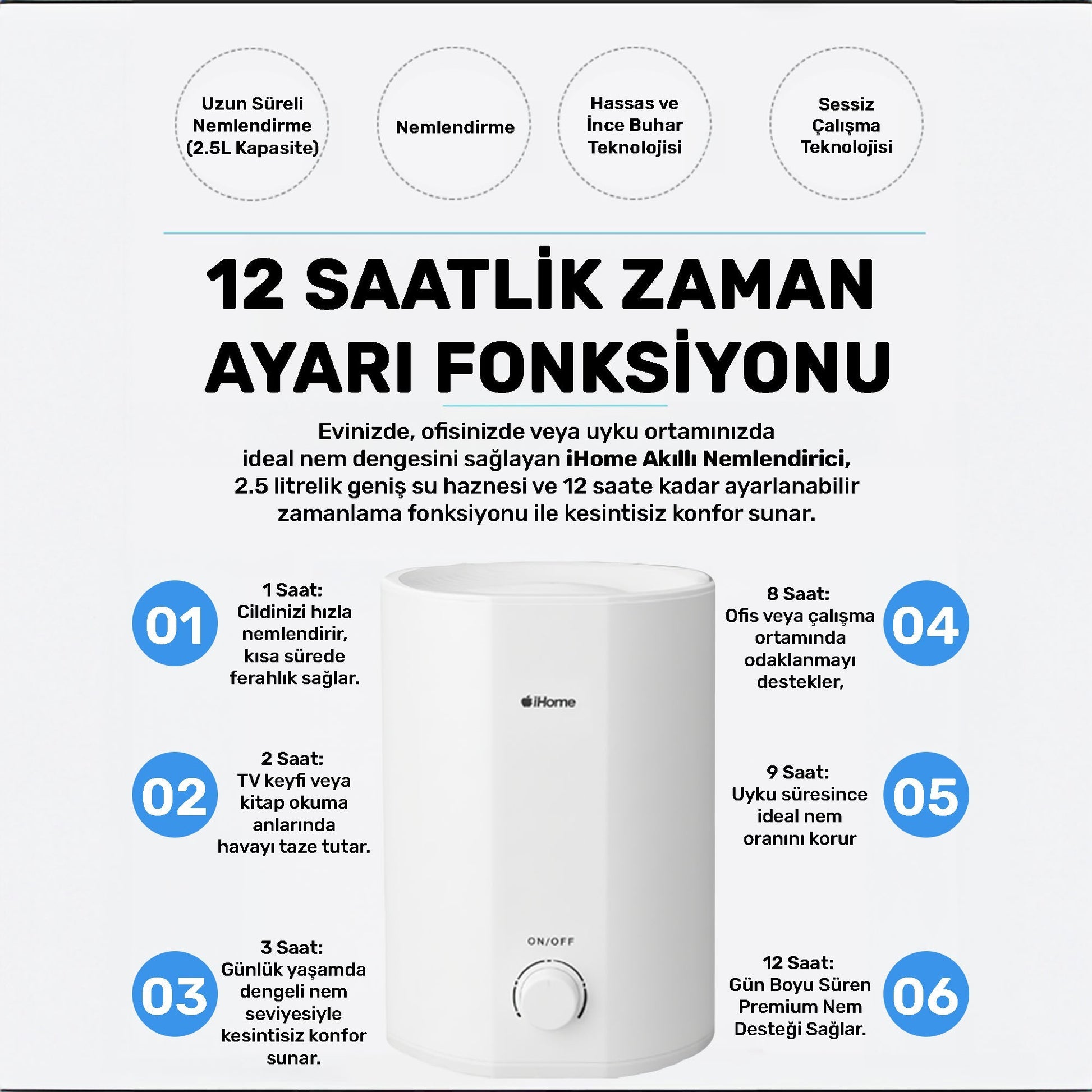 Akıllı kontrol, güvenli otomatik kapanma, düşük enerji tüketimi (25 W) ve rahat dolum yapısı ile günlük kullanımda pratik ve sağlıklıdır. Özellikle kış aylarında, klimalı ortamlarda ve kuru havanın yoğun olduğu bölgelerde ideal bir yardımcıdır.