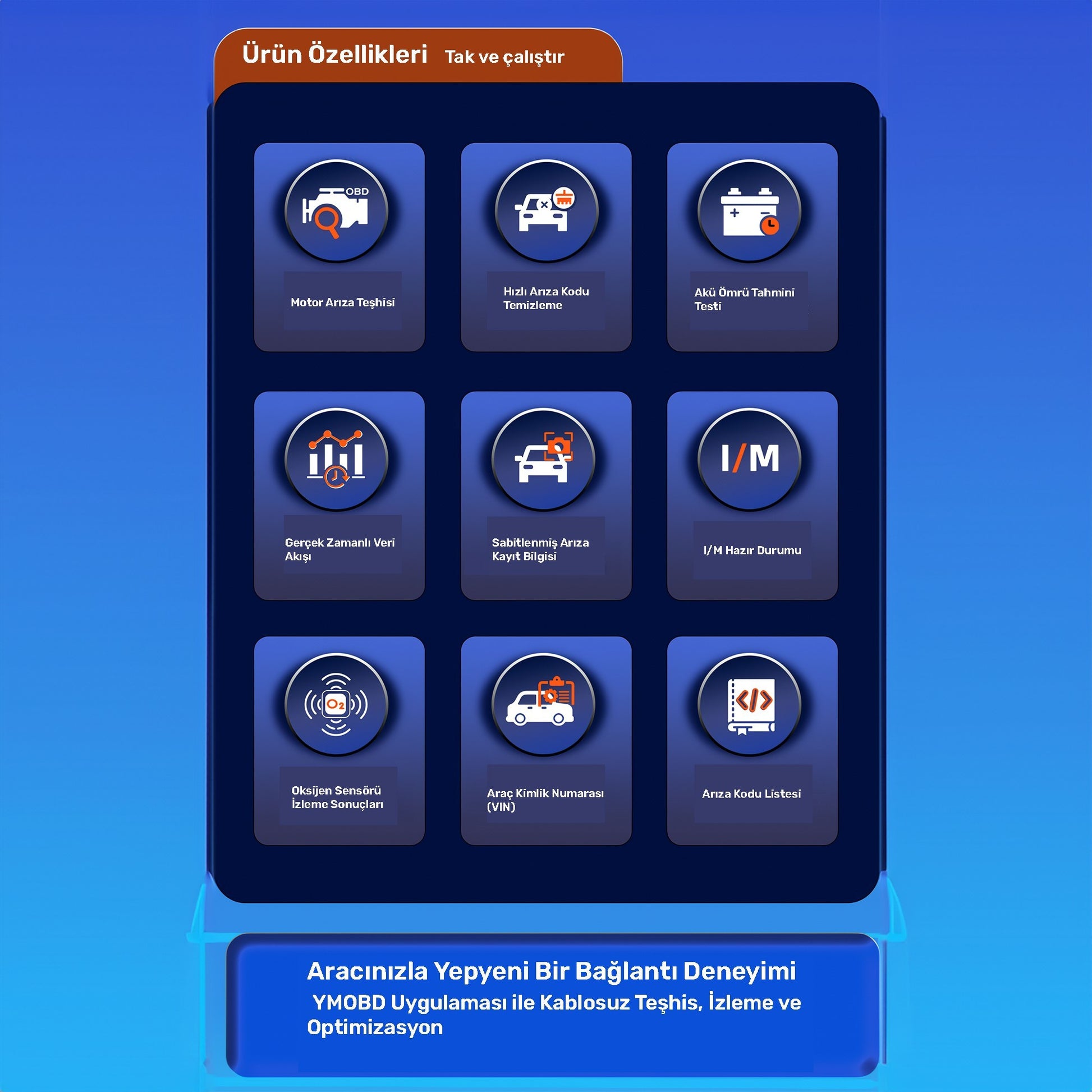 • Evrensel OBD-II desteği — birçok araç markasıyla uyumlu