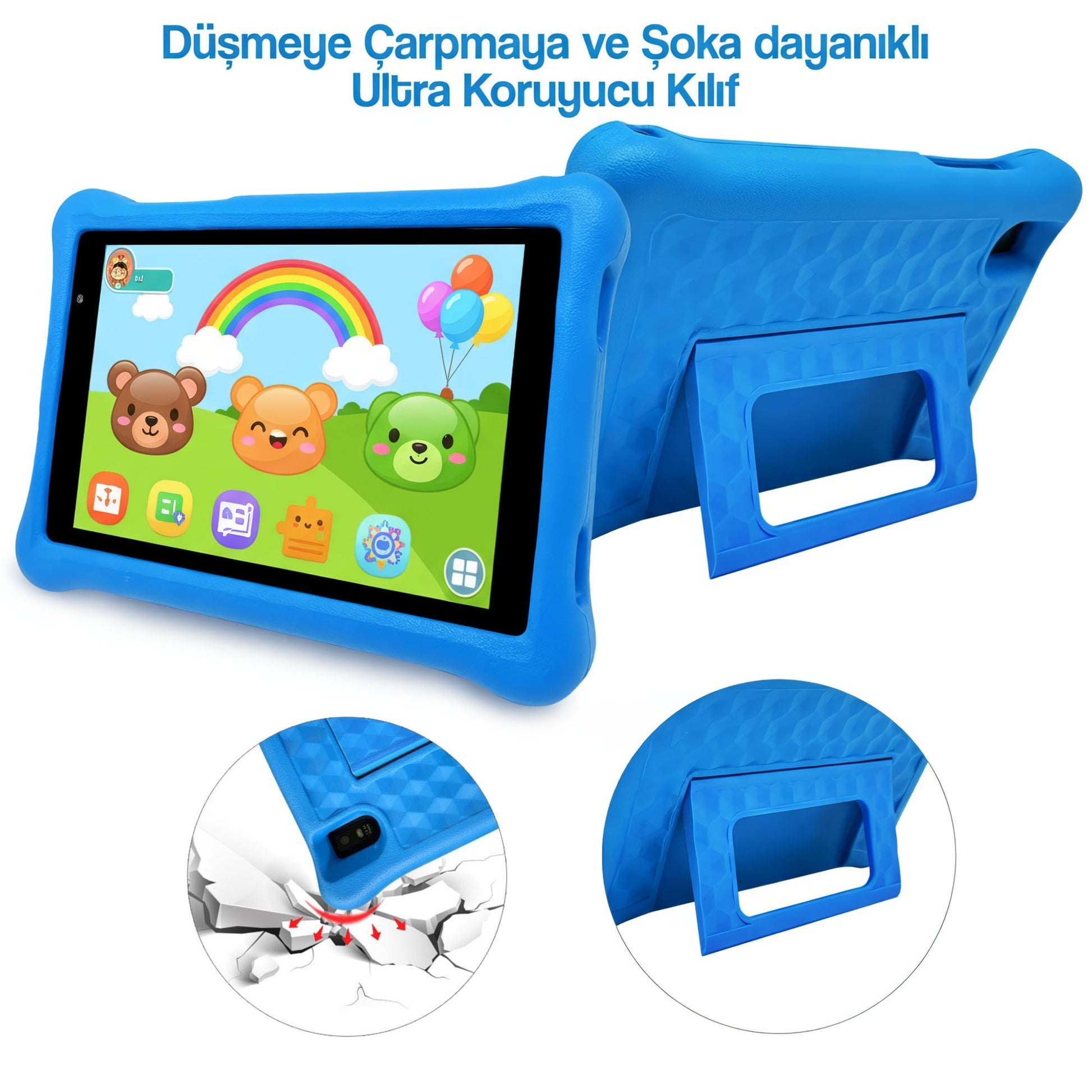 Renkli ve sağlam EVA silikon kılıf, tableti düşmelere ve darbelere karşı korur. Hafif ve ergonomik tasarımı sayesinde çocuklar kolayca taşıyabilir ve güvenle kullanabilir. Ayrıca kutu içeriğinde cam ekran koruyucu yer almaktadır.