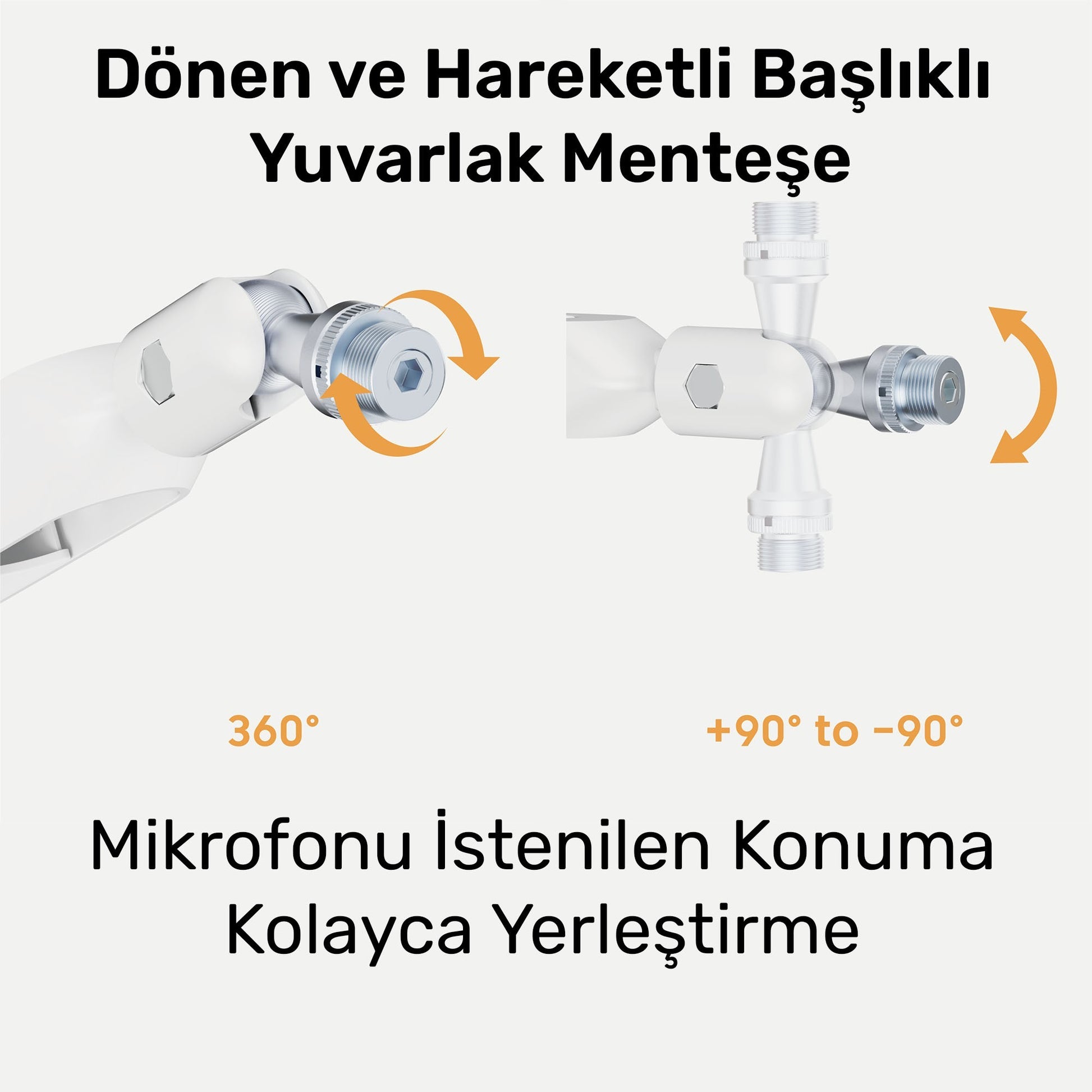Bu kol sadece estetik değil, aynı zamanda fonksiyoneldir: Dahili amortisör (süspansiyon) sistemi sayesinde klavyenizden veya masanızdan gelen rahatsız edici titreşimleri emerek sesinizin temiz kalmasını sağlar. 0.2kg'dan 1kg'a kadar (Blue Yeti, Rode, Shure vb.) tüm popüler mikrofonlarla (3/8" & 5/8" uyumlu) çalışır.