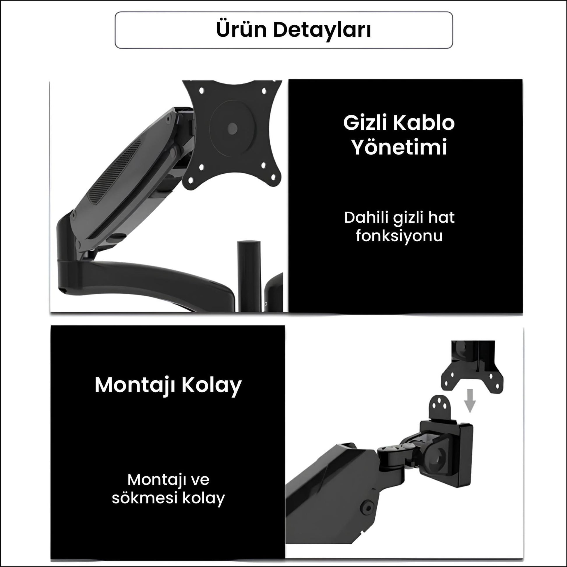 NPO, 15"-27" boyutundaki 1 monitörü kullanabilmeniz için VESA bağlantı imkanına sahip, amortisörlü ve Çift kollu monitör tutucuyu sizler için tasarladı. Dilediğiniz şekilde masanızda konumlandırma bileceğiniz monitör kolları kısa sürede kolayca montajını yapabilir ve keyifle kullanmaya başlayabilirsiniz. NPO monitör kolu, monitörünüzü yukarı/aşağı, sağa/sola ve kendi ekseninde rahatça hareket ettirmenize olanak tanır. Monitörlerin kaba ayaklarından kurtulacak ve masanızın üzerinde ferah bir alan açacaksınız.