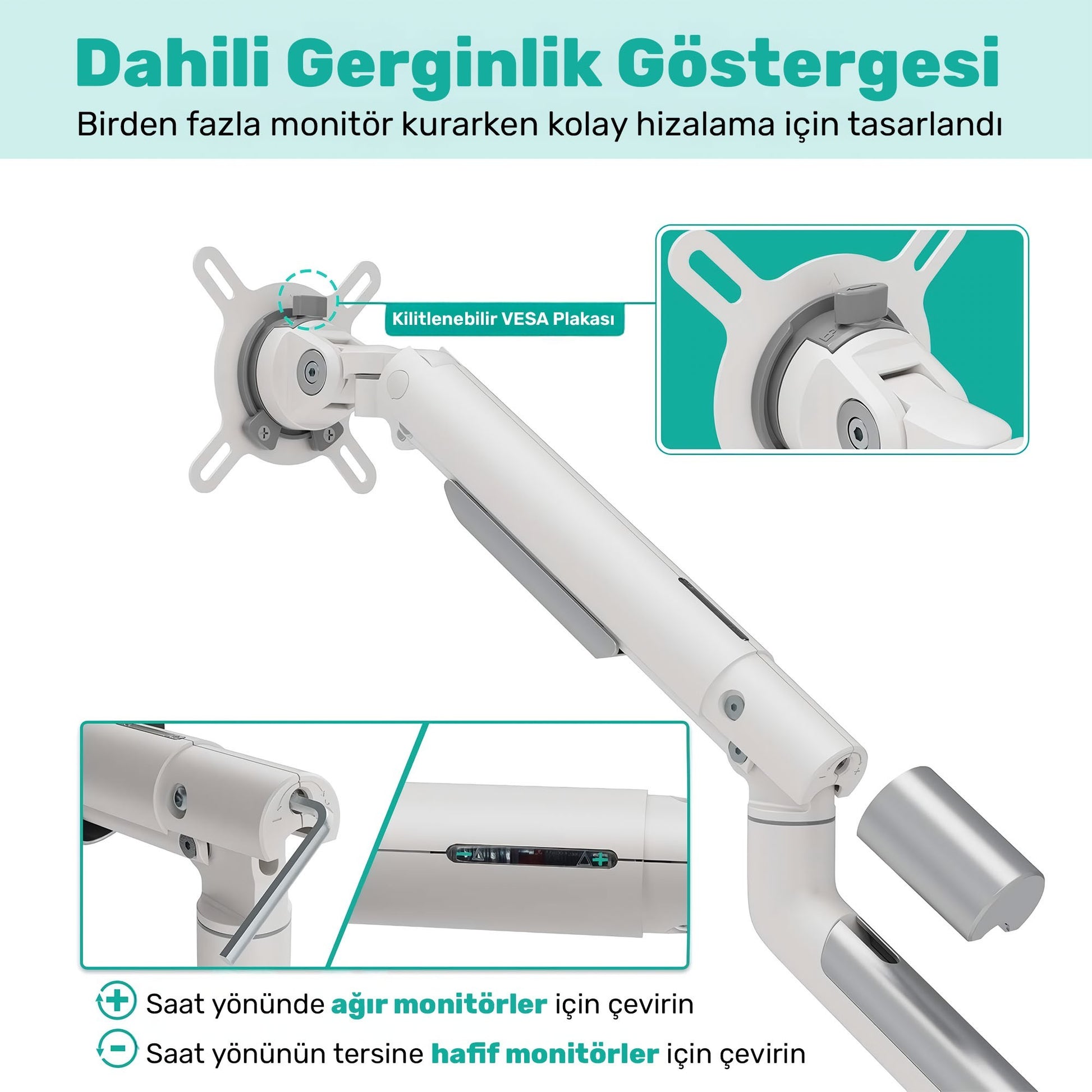2 kg'dan 9 kg'a kadar olan (17-32 inç) tüm monitörleri destekleyen gelişmiş mekanik yay sistemi, ekranınızın havada adeta "süzülmesini" sağlar. Entegre kablo yönetim kanalları ile hem fonksiyonel hem de minimalist bir şıklık sunar. Ev/ofis kullanımından, yazılımcılar için dikey kodlama ekranına kadar geniş bir kullanım esnekliği yaratır.