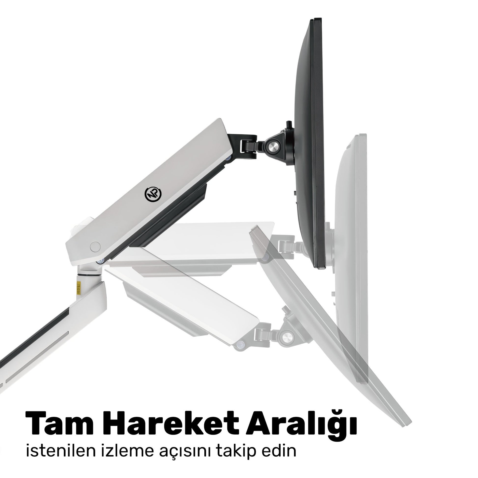 NPO STD54012HLW Elysium monitör kolu, 15 kg'a kadar olan (27-45") ağır monitörleri (kavisli dahil) bile kolaylıkla istediğiniz pozisyonda tutabilen, güçlendirilmiş bir mekanik yay sistemi ile donatılmıştır. Büyük ekranların orijinal hantal standlarından kurtulup masanızda devasa bir alan açmanızı sağlar.