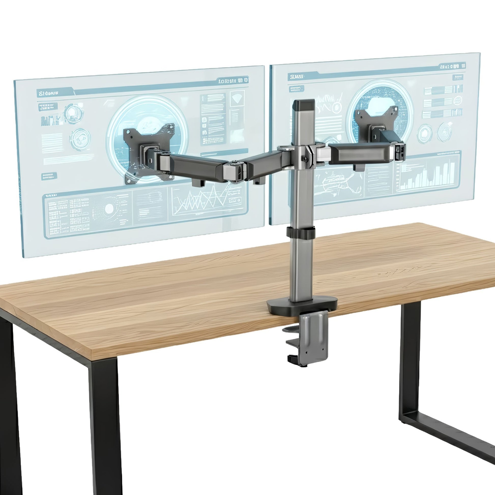 Bu model, amortisörlü kollar yerine, yüksekliği ana direk (pole) üzerinden manuel olarak ayarlanan sağlam bir yapı kullanır. 410mm'lik dikey direk, her iki monitörünüz (17-32", 9kg/kol) için de mükemmel göz hizasını bir kez bulup sabitlemenize olanak tanır.