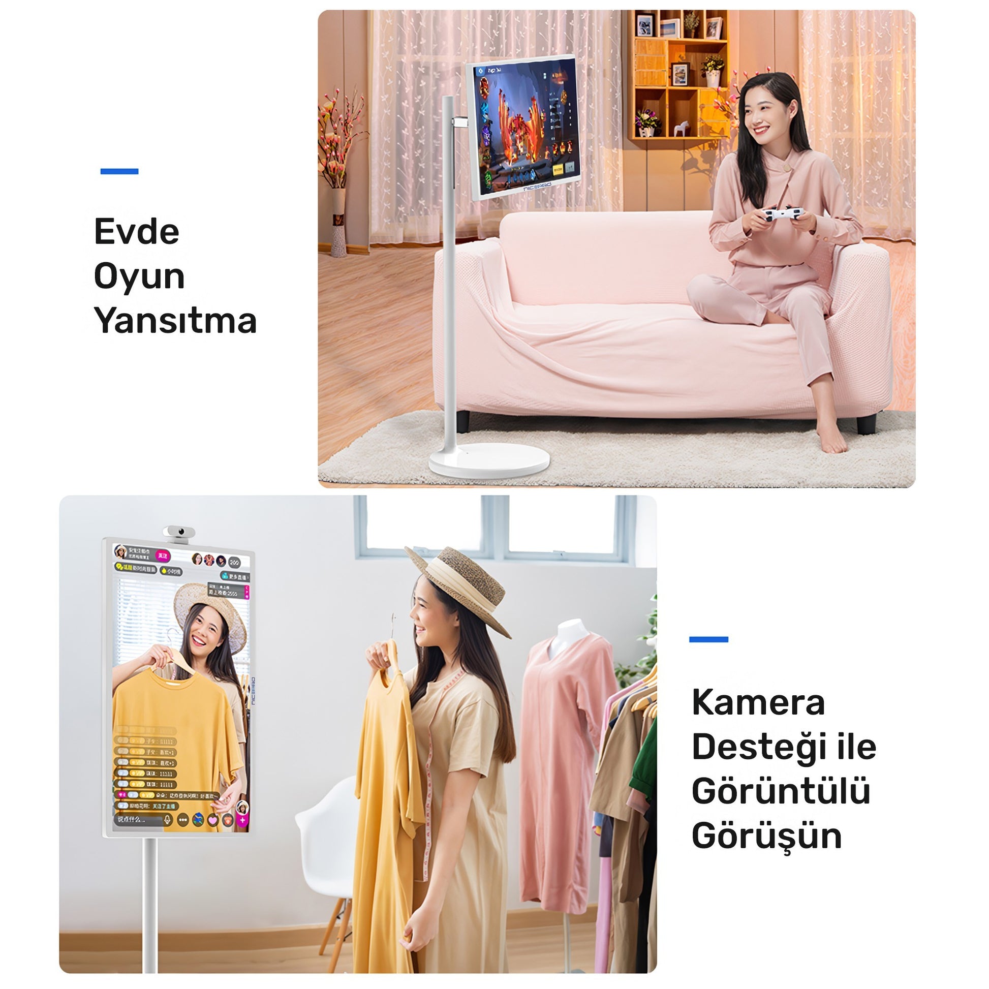 Döndürülebilir ekranı sayesinde tablet gibi kollarla veya TV gibi duvarda ve masada kullanılabilir. Multimedya, uygulama, internet ve ev içi eğlence ihtiyaçları için ideal bir cihazdır