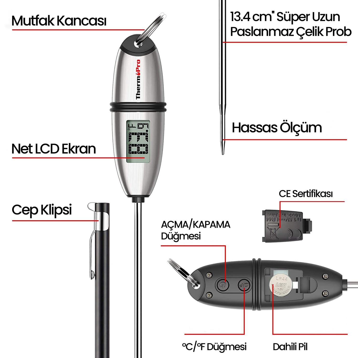 ThermoPro TP02S Işıklı Daldırma/Saplama Çelik Gövdeli Gıda Pişirme Termometresi