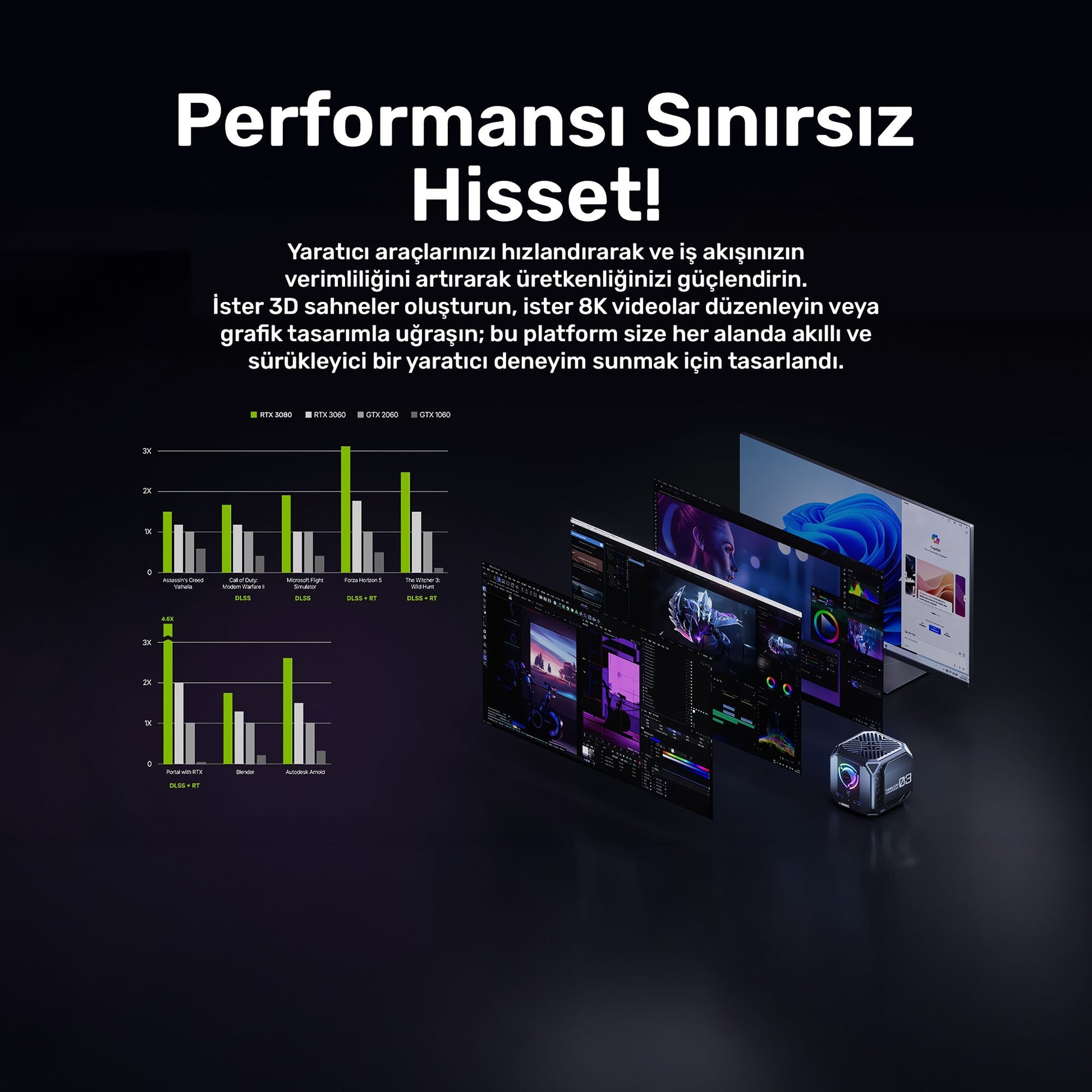 NVIDIA GeForce RTX 3080 (8 GB GDDR6) ekran kartıyla desteklenen RaXius MP M1A mini oyuncu masaüstü bilgisayar, hem güncel oyunlarda yüksek kare hızları hem de grafik yoğun uygulamalarda üstün performans sunar. Küçük boyutuna rağmen güçlü donanımıyla dikkat çeken bu cihaz, yüksek grafik gücü isteyen kullanıcılar için mükemmel bir tercihtir.