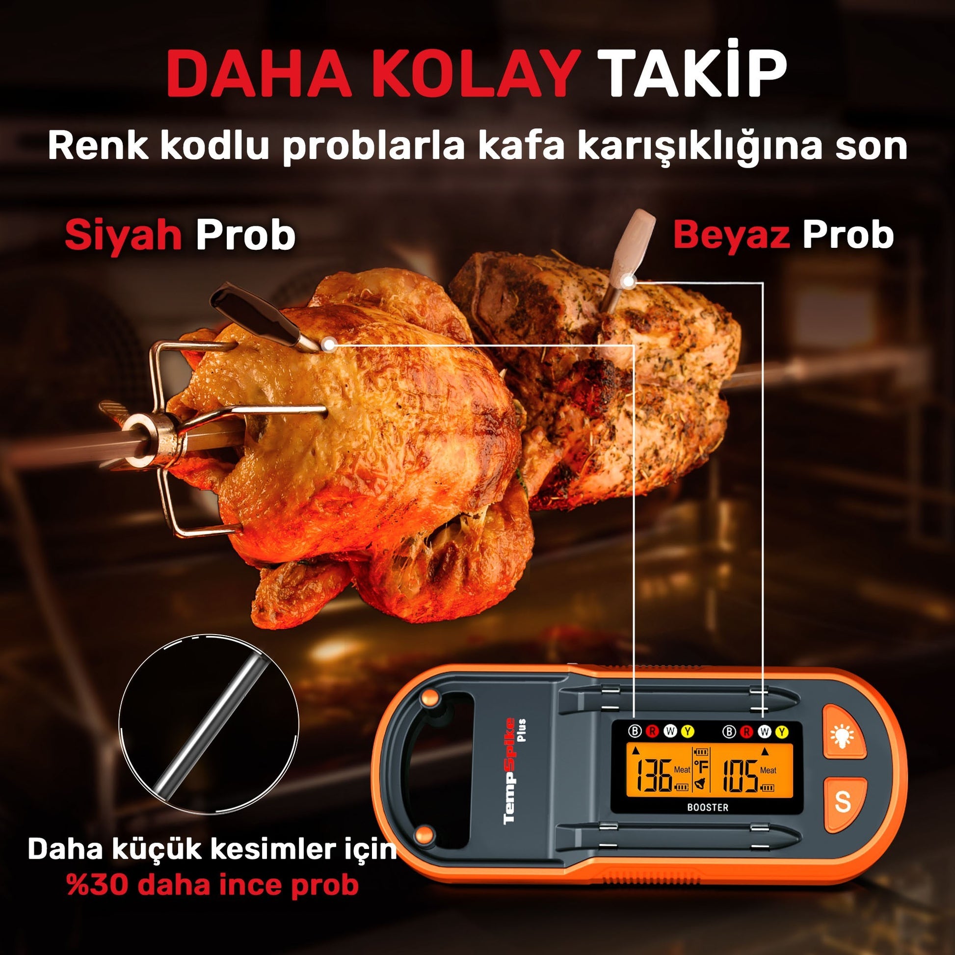 ThermoPro TP972 TempSpike Plus, pişirme deneyiminizi bir üst seviyeye taşıyan kablosuz bir et termometresidir. 182 metre menzil sunan Bluetooth 5.2 teknolojisi sayesinde, pişirme işlemi sırasında mutfakta olmasanız bile etinizin sıcaklığını akıllı telefonunuzdan takip edebilirsiniz. Tamamen kablosuz tasarımı sayesinde kablo karmaşası ve dağınıklık olmadan rahatça kullanabilirsiniz. ±1,8°F (yaklaşık ±1°C) hassasiyetle, etinizin iç sıcaklığını doğru bir şekilde ölçerek mükemmel pişirme sağlar. IPX7 su geçirmezlik sınıfı sayesinde, termometreyi su altında yıkayarak temizleyebilirsiniz. 15 dakikalık şarj ile 2 saatlik kullanım süresi sunan şarj edilebilir batarya, uzun süreli kullanım imkanı tanır.