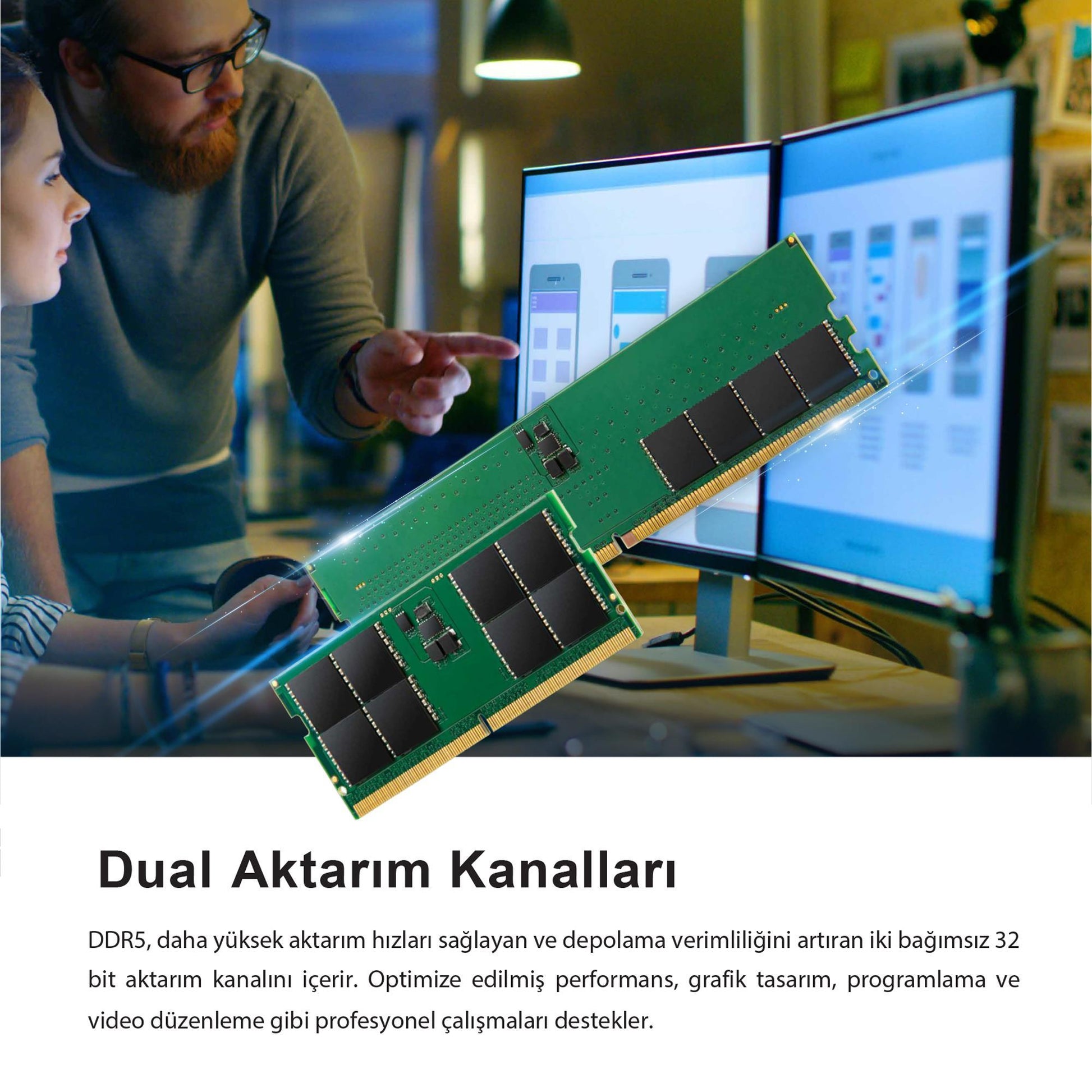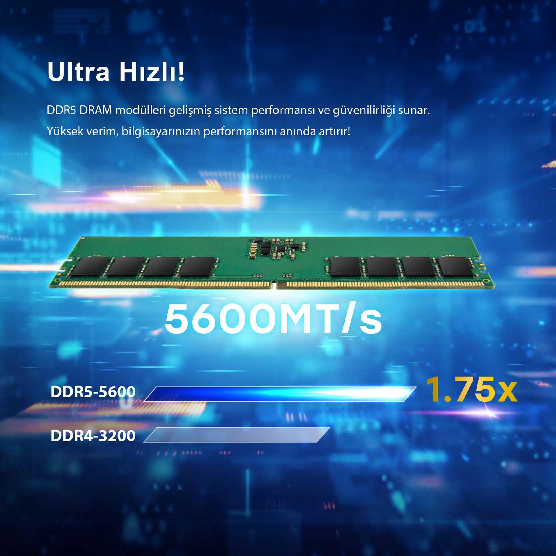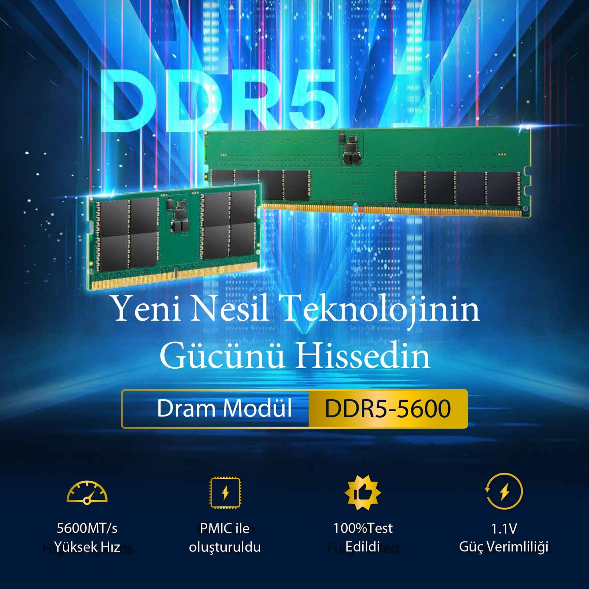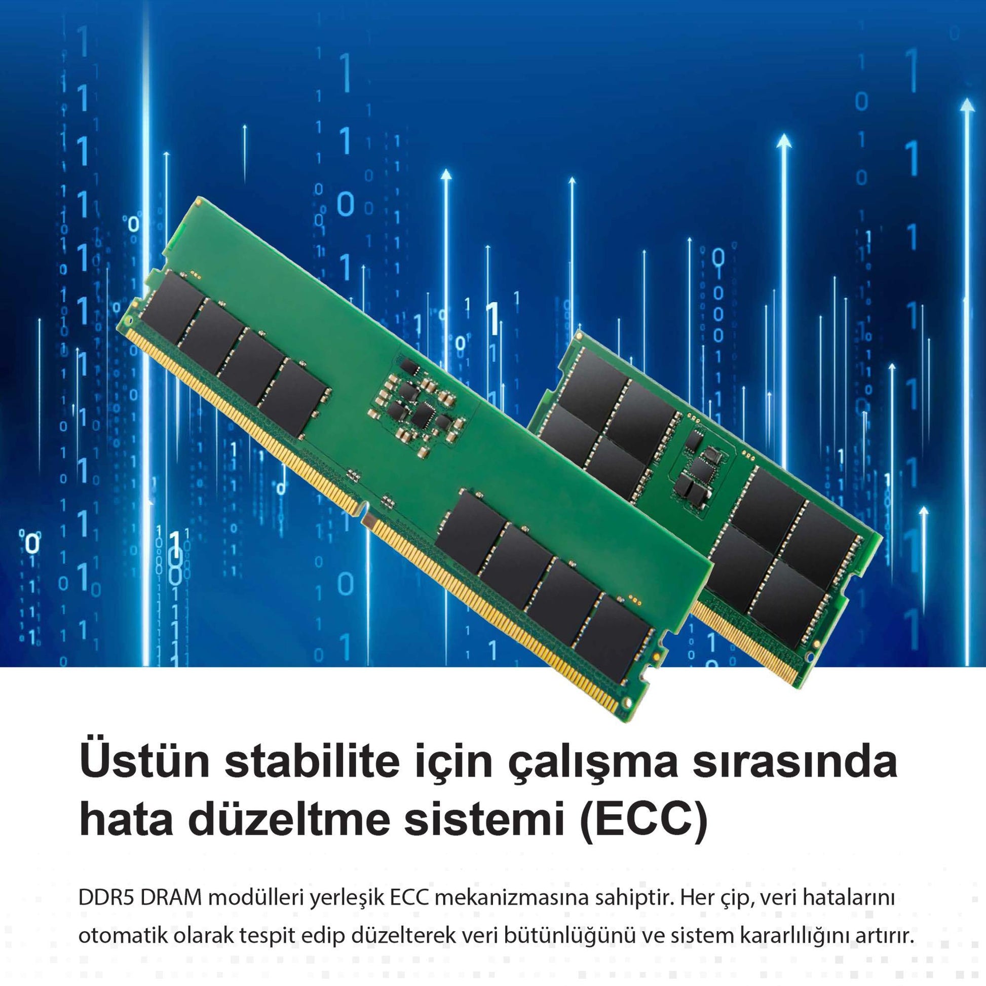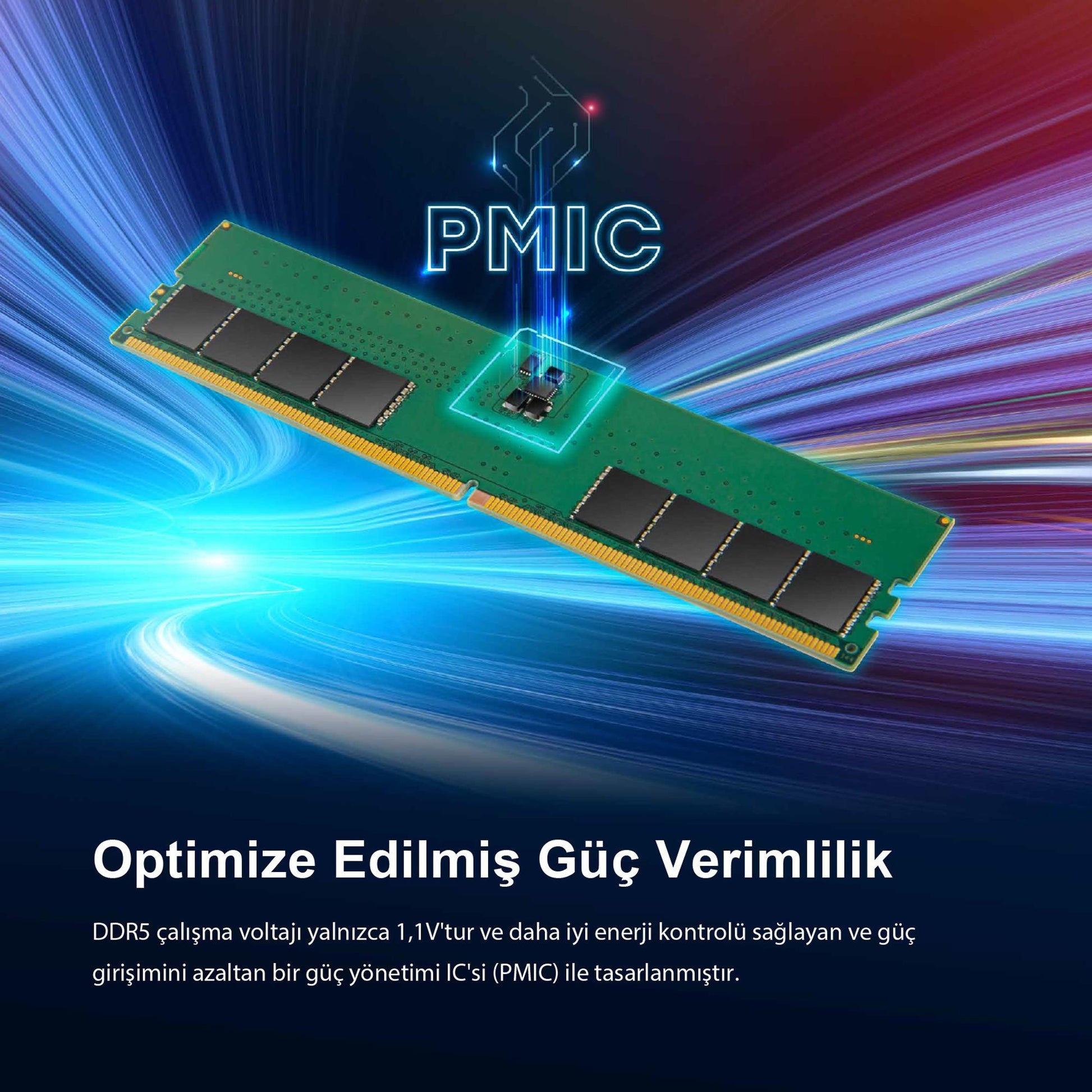 DDR5'in optimize edilmiş güç verimliliği, sadece 1,1V çalışma voltajı ile mükemmel bir enerji kontrolü sağlar. Ayrıca, güç girişimini azaltan özel bir güç yönetimi IC'si (PMIC) ile tasarlanmıştır. Bu özellikler, bilgisayarınızın daha verimli çalışmasını ve enerji tasarrufunu artırır.