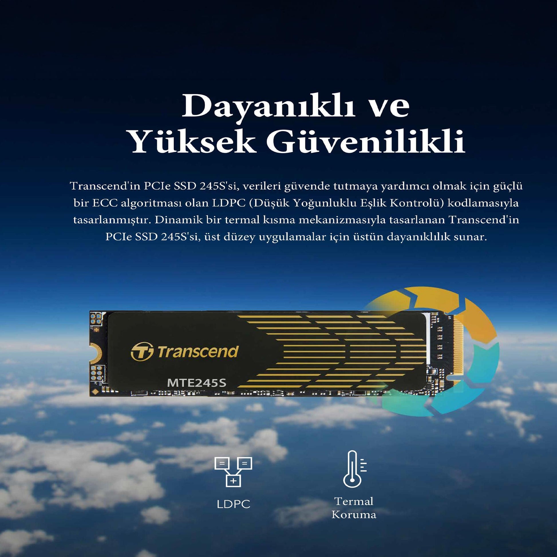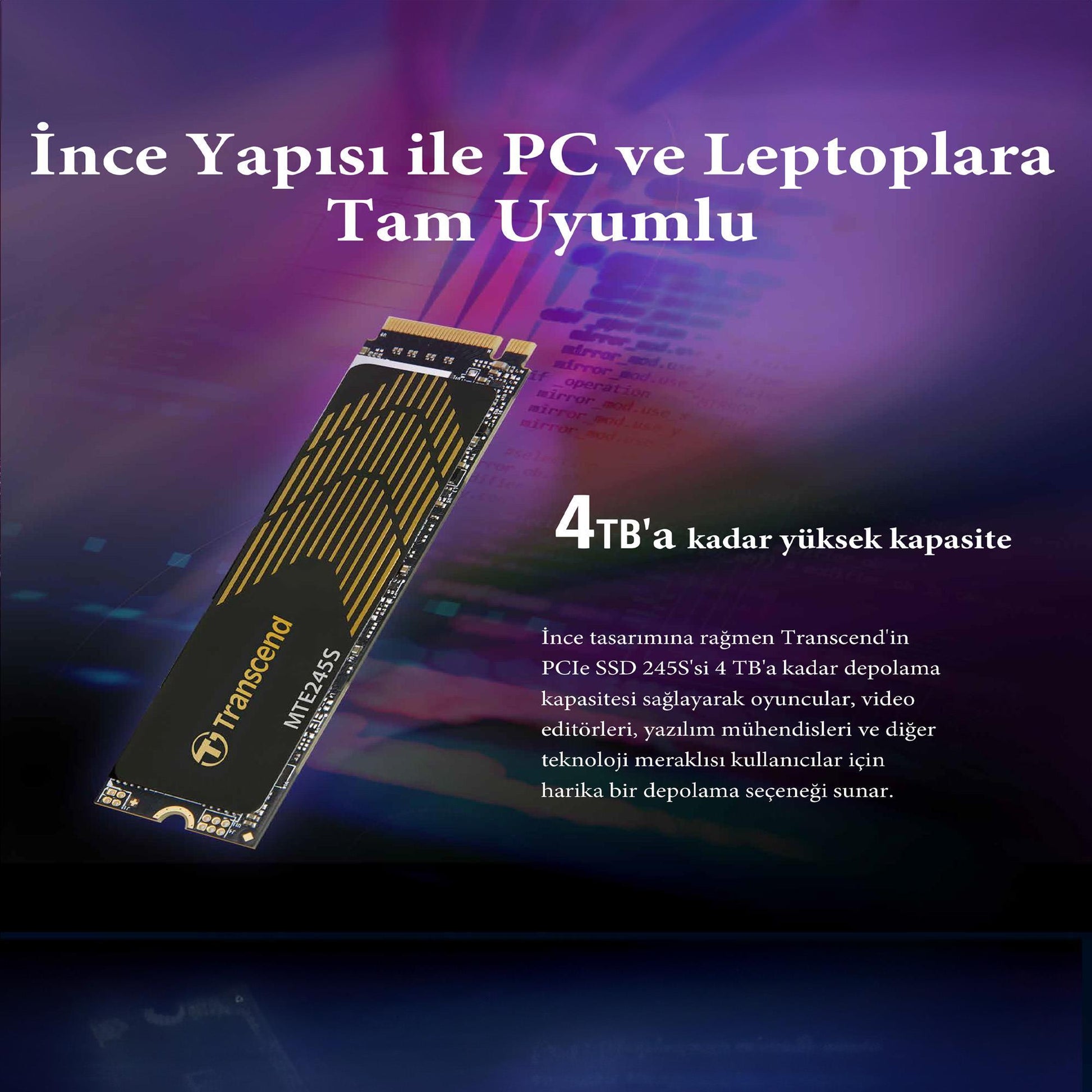 1TB depolama kapasitesine sahip Transcend'in PCIe SSD 245S'si, PCIe™ Gen4 x4 arayüzünü destekleyen en güncel NVMe 1.4 standardıyla uyumludur. Çok kanallı denetleyicisi,5.300/4.600 MB/s'ye kadar sıralı Okuma/Yazma hızları ve 630K'ya kadar IOPS sunarak masaüstü ve dizüstü bilgisayarlar için daha önce hiç görmediğiniz harıka performans ve hızlı yanıt süreleri sunar İnce tasarımına rağmen Transcend'in PCIe SSD 245S'si 4 TB'a kadar depolama kapasitesi sağlayarak oyuncular, video editörleri, yazılım mühendisleri ve diğer teknoloji meraklısı kullanıcılar için harika bir depolama seçeneği sunar.Transcend'in PCIe SSD 245S'si, verileri güvende tutmaya yardımcı olmak için güçlü bir ECC algoritması olan LDPC (Düşük Yoğunluklu Eşlik Kontrolü) kodlamasıyla tasarlanmıştır. Dinamik bir termal kısma mekanizmasıyla tasarlanan Transcend'in PCIe SSD 245S'si, üst düzey uygulamalar için üstün dayanıklılık sunar.