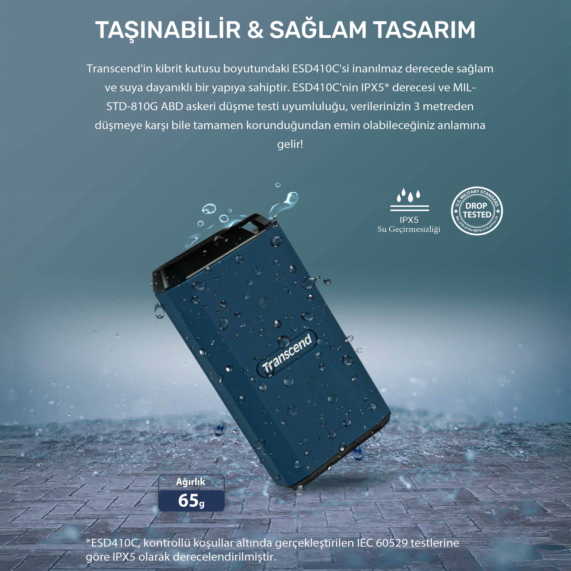 ESD410C'nin IPX5 derecesi ve MIL-STD-810G ABD askeri düşme testi uyumluluğu, verilerinizin 3 metreden düşmeye karşı tamamen korunduğundan emin olmanızı sağlar.